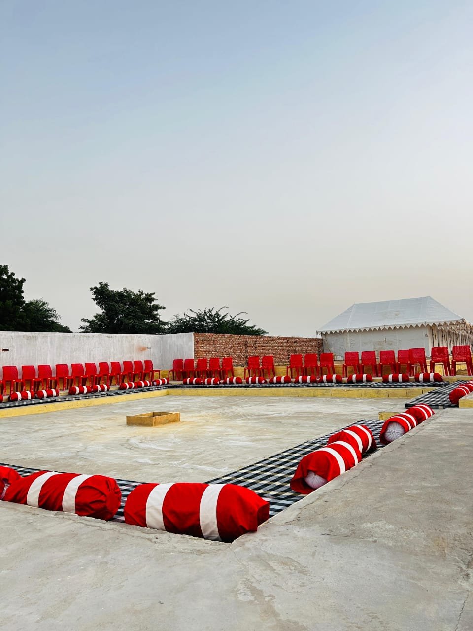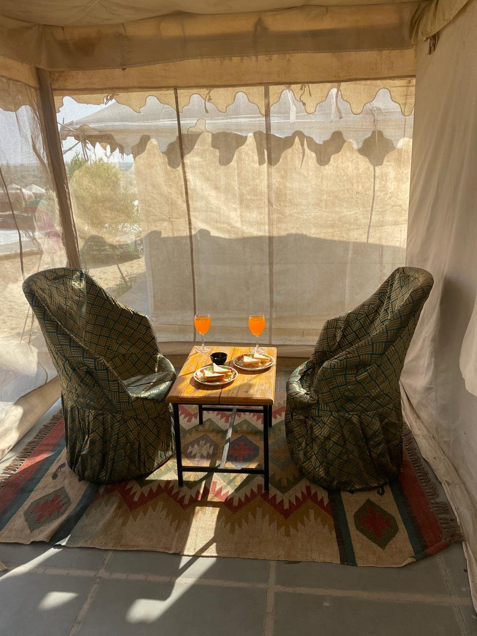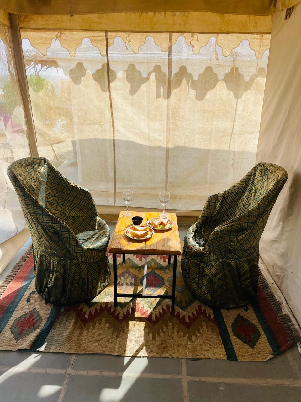Dining on the golden dunes of Jaisalmer is a magical experience that combines Rajasthani hospitality with the serenity of the desert. After a day of exploration, you are welcomed to a beautifully arranged setup where traditional seating, lanterns, and the cool desert breeze set the mood.